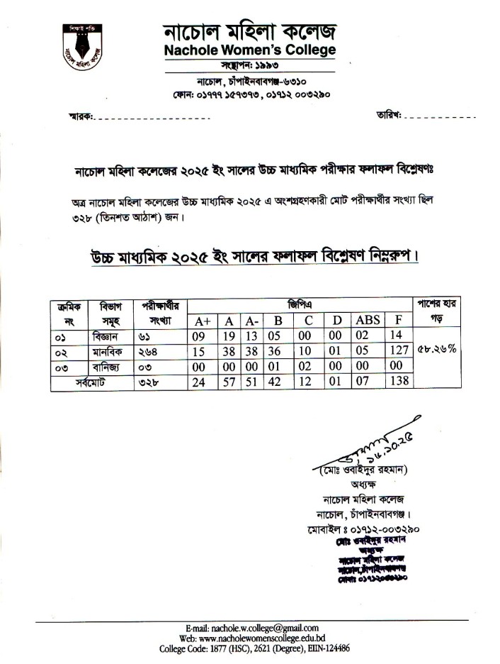 নাচোল মহিলা কলেজের উচ্চ মাধ্যমিক 2025 ফলাফল শীট।